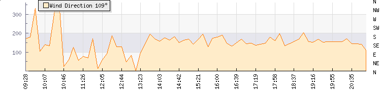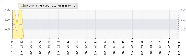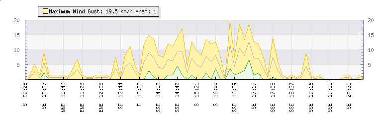 In the last few minutes the wind was South South West at an average speed of 0 kmh, reaching up to 0 kmh and a low of 0 kmh. The gust strength is0 kmh above the minimum speed |