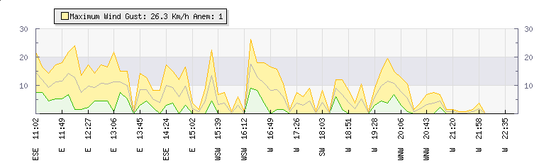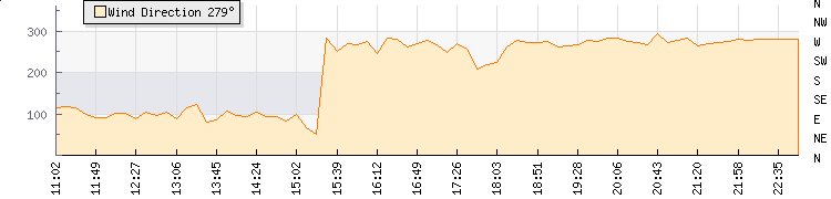 In the last few minutes the wind was Westerly at an average speed of 0 kmh, reaching up to 0 kmh and a low of 0 kmh. The gust strength is0 kmh above the minimum speed |