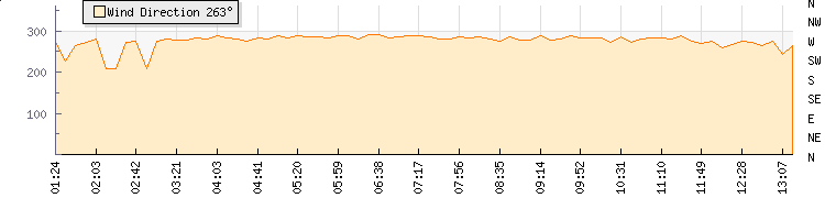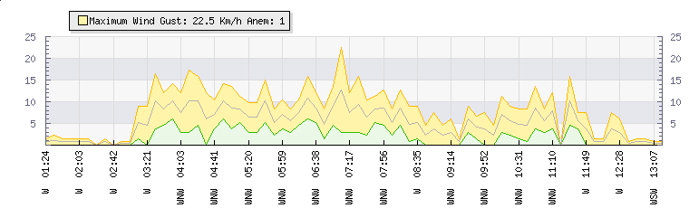 In the last few minutes the wind was West North West at an average speed of 9 kmh, reaching up to 16 kmh and a low of 3 kmh. The gust strength is13 kmh above the minimum speed |