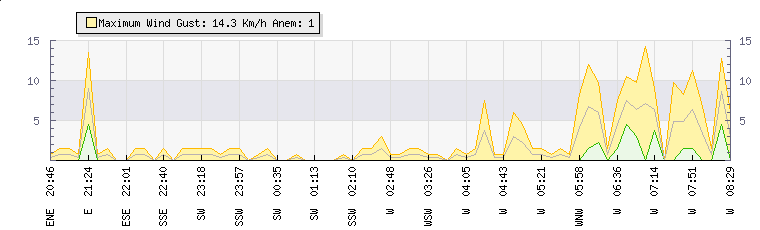 In the last few minutes the wind was South Easterly at an average speed of 1 kmh, reaching up to 2 kmh and a low of 0 kmh. The gust strength is2 kmh above the minimum speed |