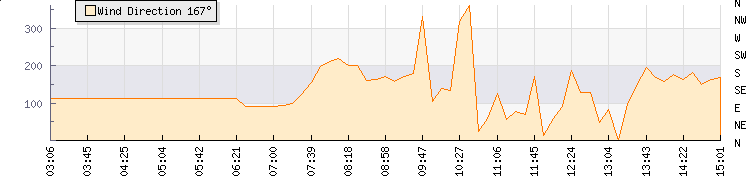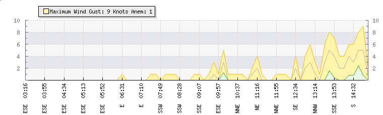 In the last few minutes the wind was South South East at an average speed of 5 knots, reaching up to 9 knots and a low of 1 knots. The gust strength is8 knots above the minimum speed |