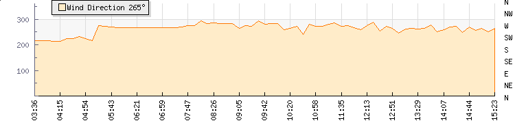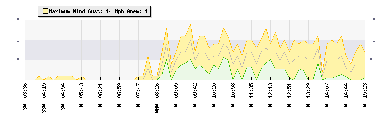 In the last few minutes the wind was Westerly at an average speed of 6 mph, reaching up to 9 mph and a low of 3 mph. The gust strength is6 mph above the minimum speed |