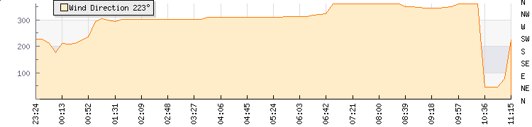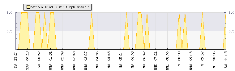 In the last few minutes the wind was North North West at an average speed of 0 mph, reaching up to 0 mph and a low of 0 mph. The gust strength is0 mph above the minimum speed |
