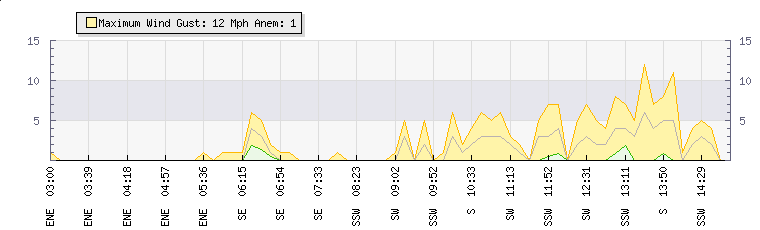 In the last few minutes the wind was South South West at an average speed of 3 mph, reaching up to 5 mph and a low of 0 mph. The gust strength is5 mph above the minimum speed |