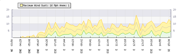 In the last few minutes the wind was East South East at an average speed of 6 mph, reaching up to 10 mph and a low of 2 mph. The gust strength is8 mph above the minimum speed |