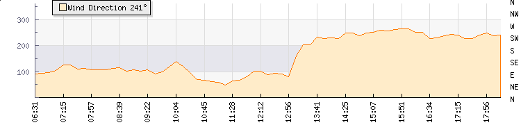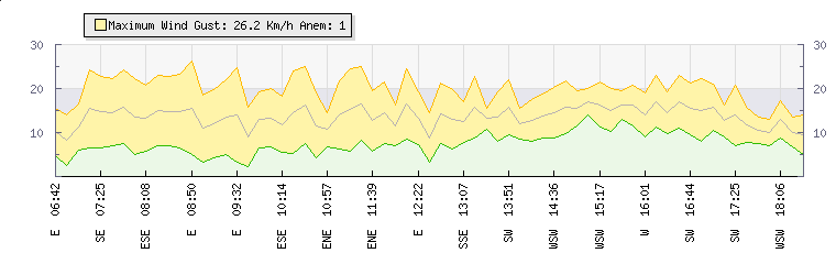 In the last few minutes the wind was West South West at an average speed of 17 kmh, reaching up to 23 kmh and a low of 11 kmh. The gust strength is12 kmh above the minimum speed |