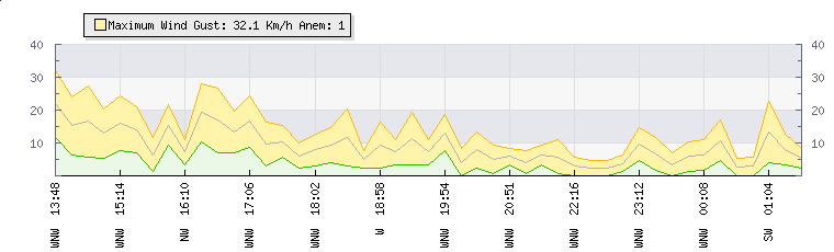 In the last few minutes the wind was Westerly at an average speed of 4 kmh, reaching up to 8 kmh and a low of 1 kmh. The gust strength is7 kmh above the minimum speed |