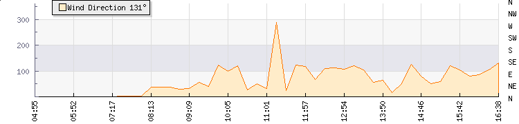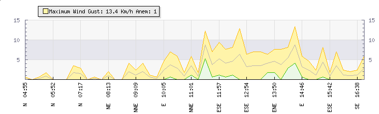 In the last few minutes the wind was East South East at an average speed of 4 kmh, reaching up to 8 kmh and a low of 1 kmh. The gust strength is7 kmh above the minimum speed |