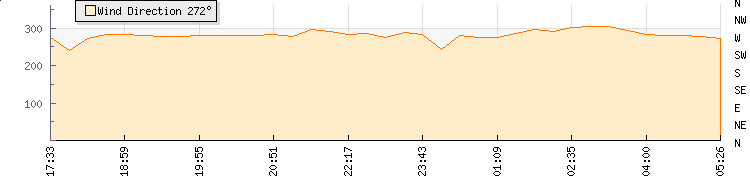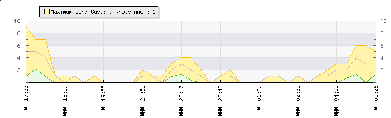 In the last few minutes the wind was West North West at an average speed of 2 knots, reaching up to 3 knots and a low of 0 knots. The gust strength is3 knots above the minimum speed |