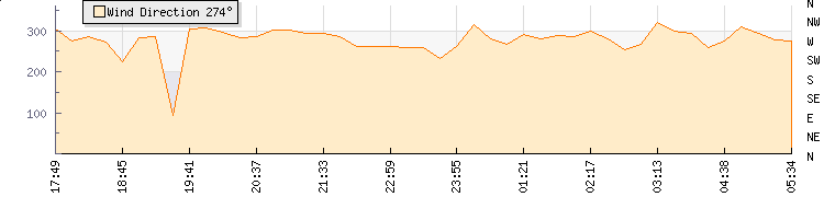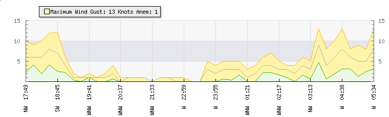 In the last few minutes the wind was Westerly at an average speed of 6 knots, reaching up to 10 knots and a low of 2 knots. The gust strength is8 knots above the minimum speed |