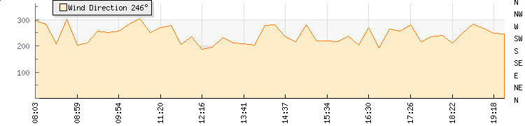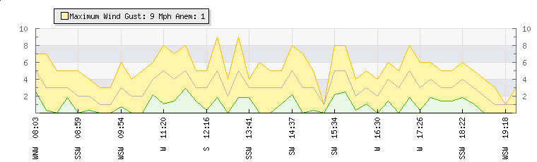 In the last few minutes the wind was South South West at an average speed of 4 mph, reaching up to 6 mph and a low of 2 mph. The gust strength is4 mph above the minimum speed |