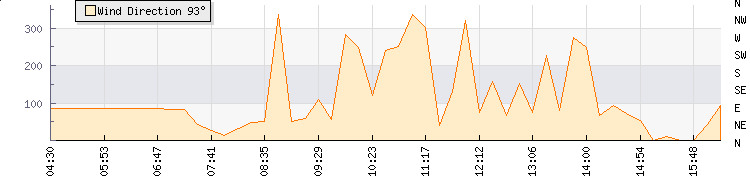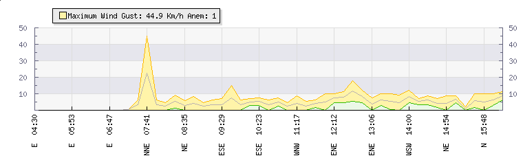 In the last few minutes the wind was North Easterly at an average speed of 4 kmh, reaching up to 9 kmh and a low of 0 kmh. The gust strength is9 kmh above the minimum speed |