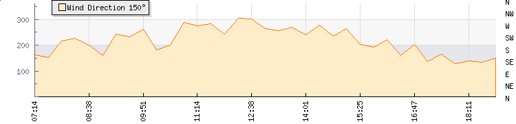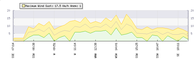 In the last few minutes the wind was South South East at an average speed of 6 kmh, reaching up to 8 kmh and a low of 4 kmh. The gust strength is4 kmh above the minimum speed |