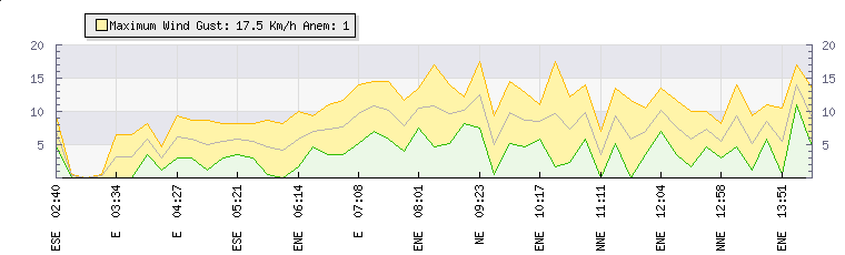 In the last few minutes the wind was East North East at an average speed of 3 kmh, reaching up to 6 kmh and a low of 0 kmh. The gust strength is6 kmh above the minimum speed |