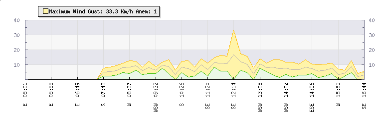In the last few minutes the wind was South Westerly at an average speed of 6 kmh, reaching up to 11 kmh and a low of 2 kmh. The gust strength is9 kmh above the minimum speed |