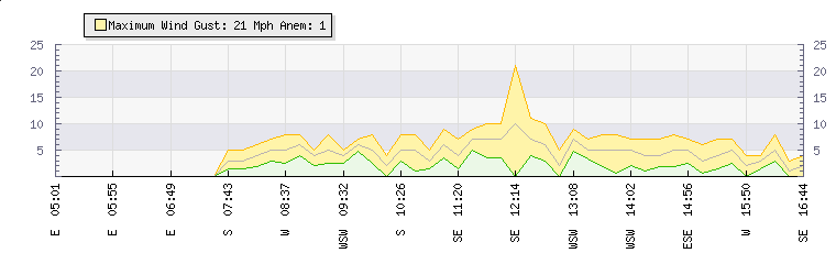 In the last few minutes the wind was South Westerly at an average speed of 4 mph, reaching up to 7 mph and a low of 1 mph. The gust strength is6 mph above the minimum speed |