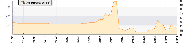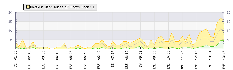 In the last few minutes the wind was North North East at an average speed of 4 knots, reaching up to 7 knots and a low of 1 knots. The gust strength is6 knots above the minimum speed |