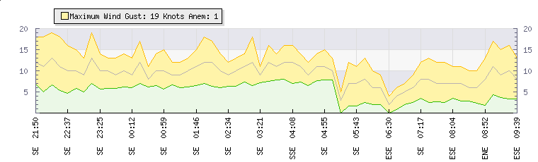 In the last few minutes the wind was East South East at an average speed of 7 knots, reaching up to 11 knots and a low of 3 knots. The gust strength is8 knots above the minimum speed |
