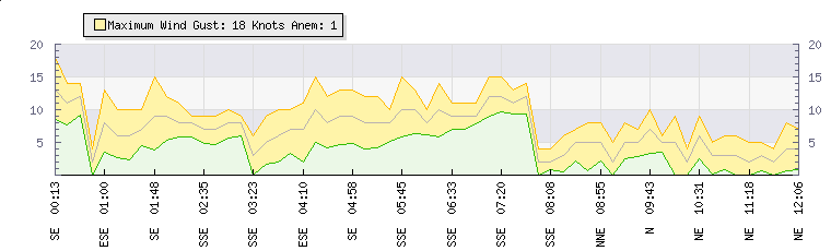 In the last few minutes the wind was North Easterly at an average speed of 3 knots, reaching up to 5 knots and a low of 0 knots. The gust strength is5 knots above the minimum speed |