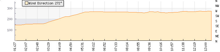 In the last few minutes the wind was Westerly at an average speed of 15 kmh, reaching up to 19 kmh and a low of 10 kmh. The gust strength is9 kmh above the minimum speed |