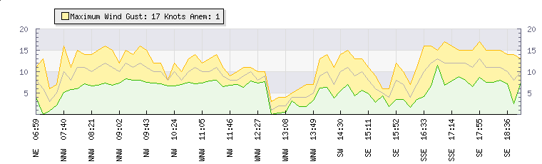 In the last few minutes the wind was South Easterly at an average speed of 4 knots, reaching up to 7 knots and a low of 2 knots. The gust strength is5 knots above the minimum speed |