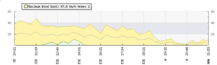 In the last few minutes the wind was Westerly at an average speed of 2 kmh, reaching up to 4 kmh and a low of 0 kmh. The gust strength is4 kmh above the minimum speed |