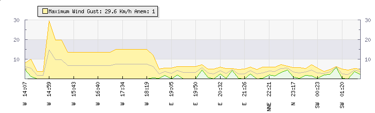 In the last few minutes the wind was South Westerly at an average speed of 3 kmh, reaching up to 6 kmh and a low of 0 kmh. The gust strength is6 kmh above the minimum speed |
