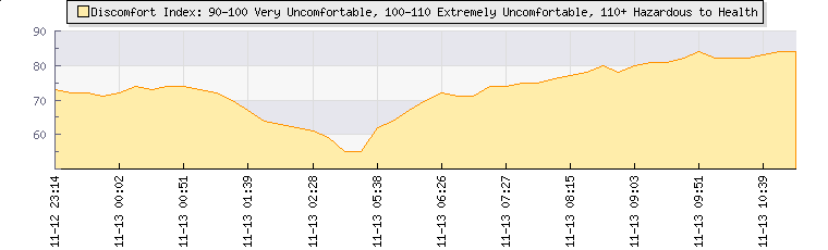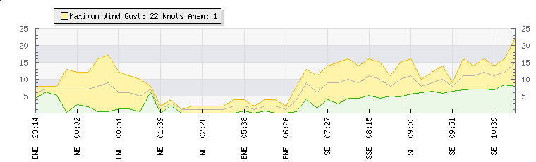 In the last few minutes the wind was South Easterly at an average speed of 11 knots, reaching up to 16 knots and a low of 6 knots. The gust strength is10 knots above the minimum speed |