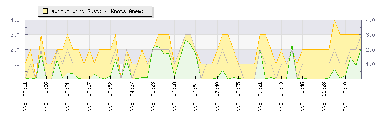 In the last few minutes the wind was North North East at an average speed of 1 knots, reaching up to 2 knots and a low of 0 knots. The gust strength is2 knots above the minimum speed |