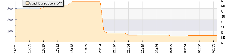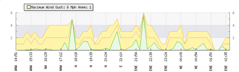 In the last few minutes the wind was East North East at an average speed of 2 mph, reaching up to 3 mph and a low of 1 mph. The gust strength is2 mph above the minimum speed |