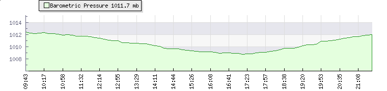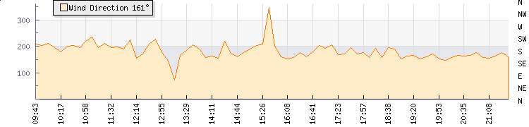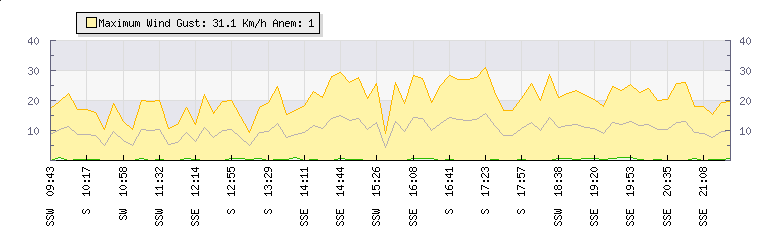 In the last few minutes the wind was Southerly at an average speed of 12 kmh, reaching up to 23 kmh and a low of 1 kmh. The gust strength is22 kmh above the minimum speed |