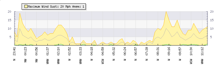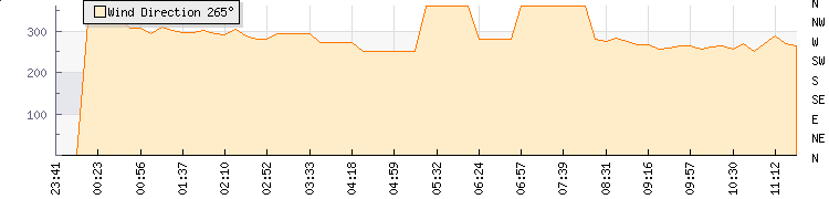 In the last few minutes the wind was Westerly at an average speed of 3 mph, reaching up to 6 mph and a low of 0 mph. The gust strength is6 mph above the minimum speed |