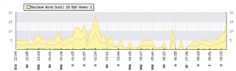 In the last few minutes the wind was Easterly at an average speed of 2 mph, reaching up to 4 mph and a low of 0 mph. The gust strength is4 mph above the minimum speed |