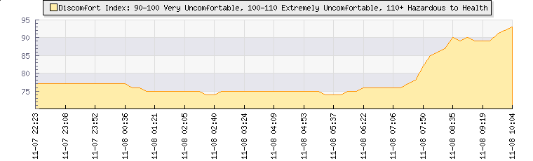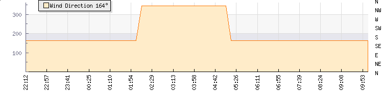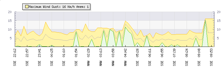 In the last few minutes the wind was North North West at an average speed of 5 kmh, reaching up to 11 kmh and a low of 0 kmh. The gust strength is11 kmh above the minimum speed |