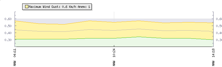 In the last few minutes the wind was North North West at an average speed of 1 kmh, reaching up to 1 kmh and a low of 0 kmh. The gust strength is1 kmh above the minimum speed |