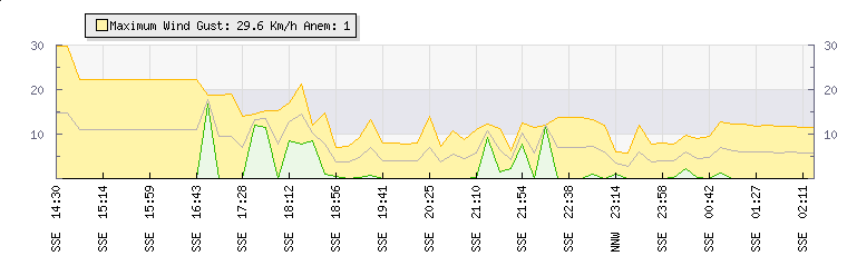 In the last few minutes the wind was South South East at an average speed of 6 kmh, reaching up to 10 kmh and a low of 2 kmh. The gust strength is8 kmh above the minimum speed |