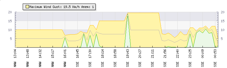 In the last few minutes the wind was South South East at an average speed of 9 kmh, reaching up to 11 kmh and a low of 8 kmh. The gust strength is3 kmh above the minimum speed |