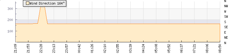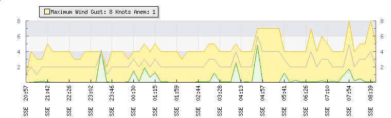 In the last few minutes the wind was South South East at an average speed of 2 knots, reaching up to 4 knots and a low of 0 knots. The gust strength is4 knots above the minimum speed |