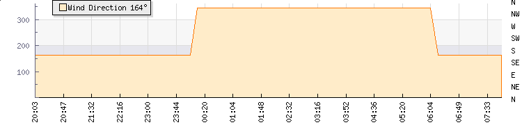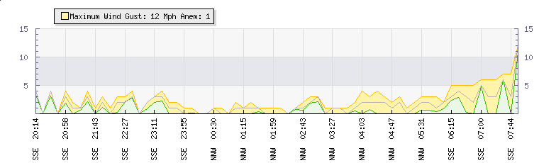 In the last few minutes the wind was South South East at an average speed of 2 mph, reaching up to 4 mph and a low of 0 mph. The gust strength is4 mph above the minimum speed |