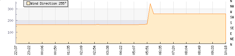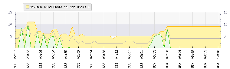 In the last few minutes the wind was West South West at an average speed of 4 mph, reaching up to 9 mph and a low of 0 mph. The gust strength is9 mph above the minimum speed |