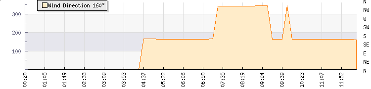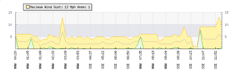 In the last few minutes the wind was South South East at an average speed of 1 mph, reaching up to 1 mph and a low of 0 mph. The gust strength is1 mph above the minimum speed |