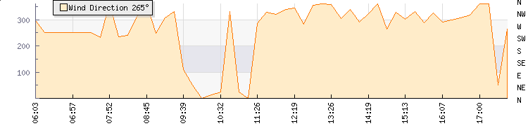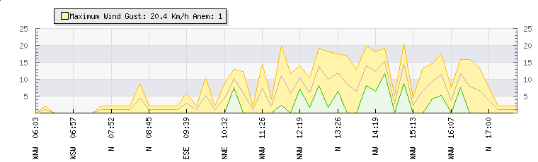 In the last few minutes the wind was West North West at an average speed of 9 kmh, reaching up to 15 kmh and a low of 4 kmh. The gust strength is11 kmh above the minimum speed |