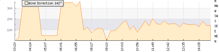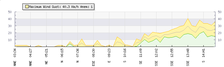 In the last few minutes the wind was South South East at an average speed of 29 kmh, reaching up to 40 kmh and a low of 19 kmh. The gust strength is21 kmh above the minimum speed |