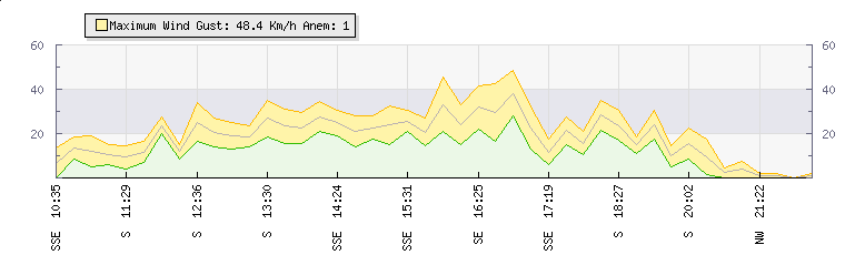 In the last few minutes the wind was South South East at an average speed of 10 kmh, reaching up to 18 kmh and a low of 2 kmh. The gust strength is16 kmh above the minimum speed |
