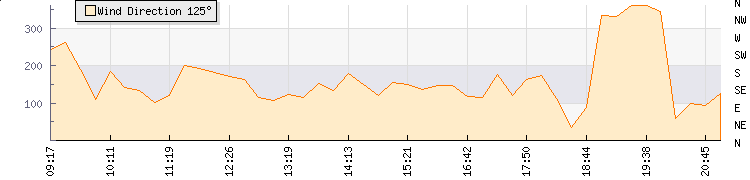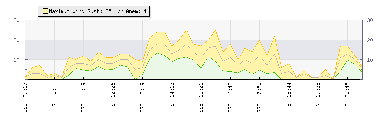 In the last few minutes the wind was East South East at an average speed of 8 mph, reaching up to 14 mph and a low of 3 mph.  The gust strength is11 mph above the minimum speed             |