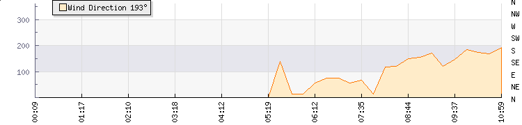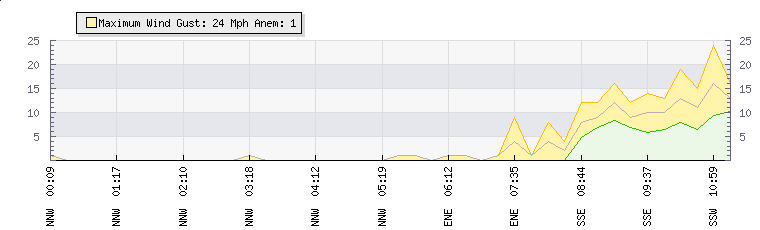 In the last few minutes the wind was East South East at an average speed of 2 mph, reaching up to 4 mph and a low of 0 mph. The gust strength is4 mph above the minimum speed |