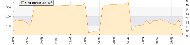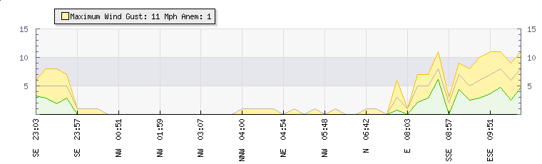 In the last few minutes the wind was South South East at an average speed of 8 mph, reaching up to 11 mph and a low of 6 mph. The gust strength is5 mph above the minimum speed |