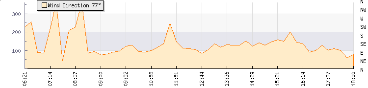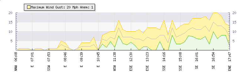 In the last few minutes the wind was South Easterly at an average speed of 11 mph, reaching up to 17 mph and a low of 6 mph. The gust strength is11 mph above the minimum speed |