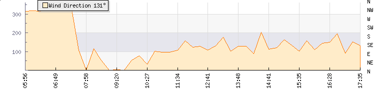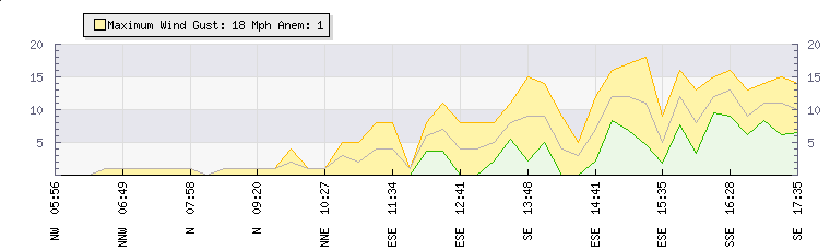 In the last few minutes the wind was South Easterly at an average speed of 12 mph, reaching up to 15 mph and a low of 9 mph. The gust strength is6 mph above the minimum speed |