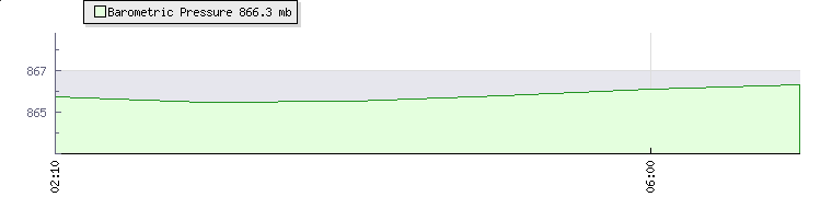 | Wind Speed: | 0|1|1 knots | Wind Direction: | SSW 201° | Temperature: | 14.1°C |  | Wet Bulb: | 13.8°C | Discomfort: | 66 | Humidity: | 97% |  | Rainfall Today: | 0mm | 12 hrs Rainfall: | 0mm | 24 hrs Rainfall: | 4mm |  | Barometer: | 865.5mb | Dew Point: | 13.7°C | Clouds AGL: | 188ft (57 m) |  | Density-Alt: | 11322ft (3451 m) | Fire Danger: |  |